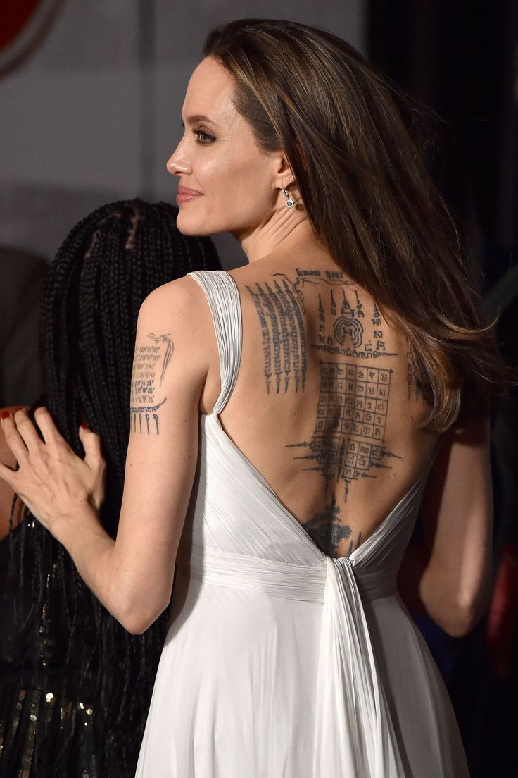 50-годишната Анджелина Джоли отново се оказа в центъра на дискусиите, след като се появи на публично място с рокля с открит гръб. За първи път феновете успяха да видят това, което актрисата години наред криеше под дрехите си – обширна композиция от дванадесет татуировки, всяка от които има свое значение: от лични символи до будистки талисмани.